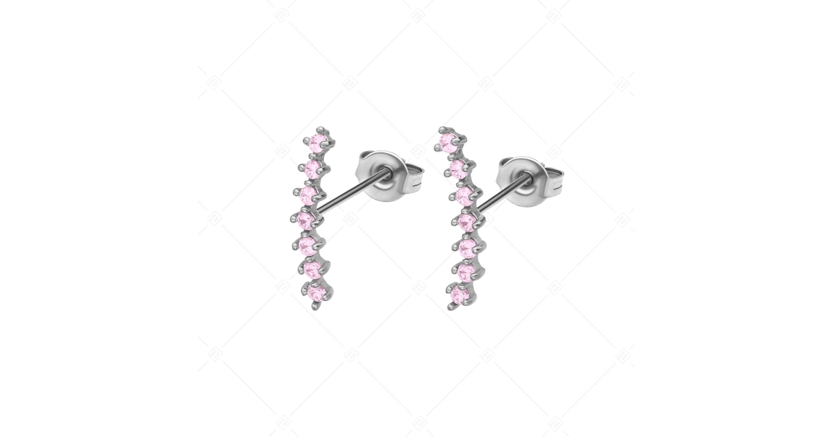 Káprázatos, rózsaszínű cirkon kövekkel kirakott, félkör íves, bedugós fülbevaló. Antiallergén, 316L orvosi nemesacél ékszer, amely anyagának köszönhetően rendkívül tartós, a mindennapi viselet során.