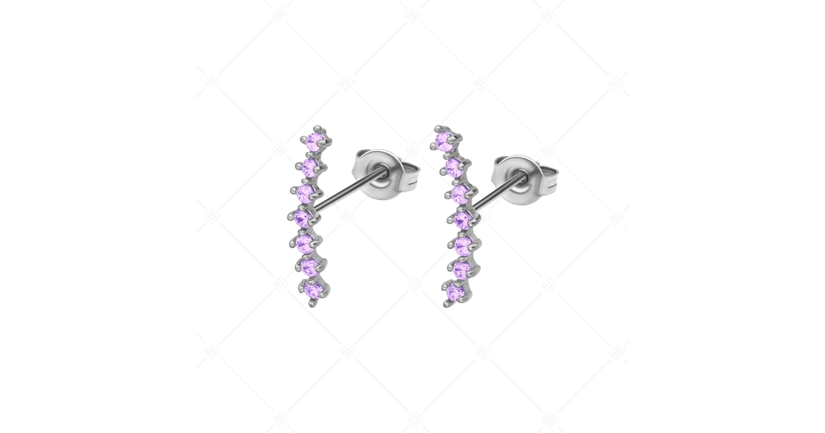 Káprázatos, lila színű cirkon kövekkel kirakott, félkör íves, bedugós fülbevaló. Antiallergén, 316L orvosi nemesacél ékszer, amely anyagának köszönhetően rendkívül tartós, a mindennapi viselet során.
