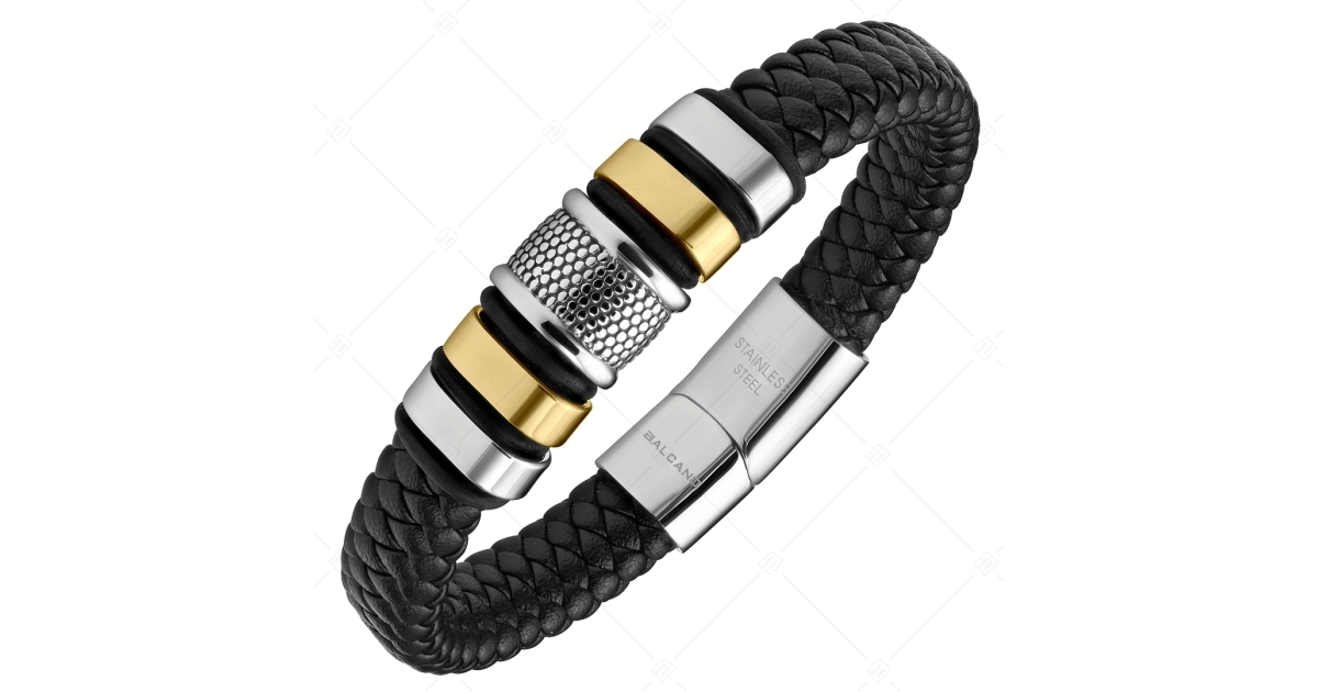BALCANO - Harvey / Fonott marhabőr karkötő több részes nemesacél fejrésszel és 18K arany bevonattal