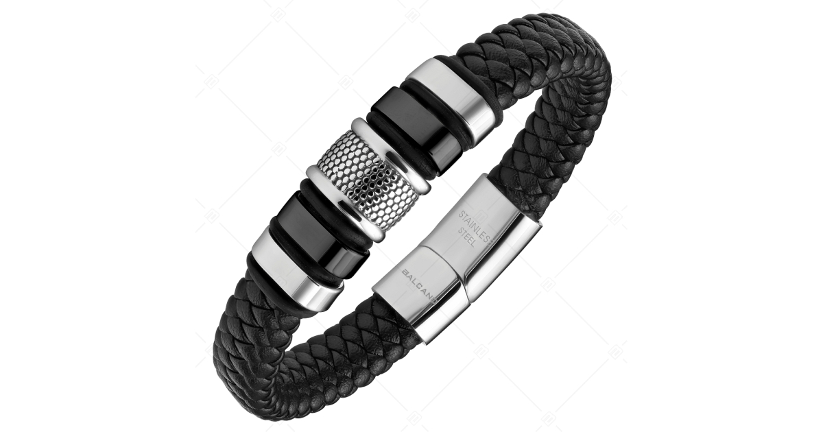 BALCANO - Harvey / Fonott marhabőr karkötő több részes nemesacél fejrésszel és fekete PVD bevonattal