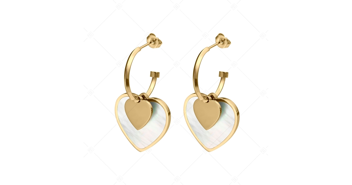 Trendi, 316L orvosi nemesacél fülbevaló, 18K arany bevonattal. Félkör alakú fülbevaló pillangózárral, amit két, egy kisebb sima felületű, és egy nagyobb gyöngyház bevonattal ellátott szív forma díszít.