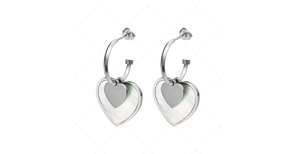 Trendi, 316L orvosi nemesacél fülbevaló, magasfényű polírozással. Félkör alakú fülbevaló pillangózárral, amit két, egy kisebb sima felületű, és egy nagyobb gyöngyház bevonattal ellátott szív forma díszít.