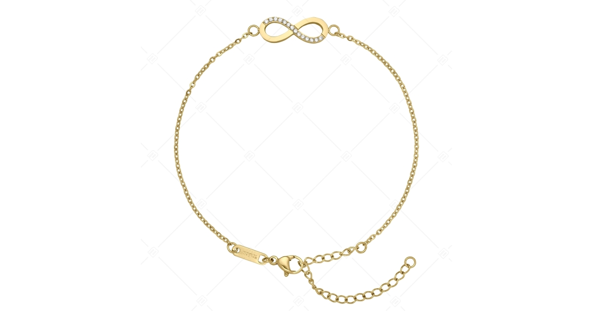 Végtelen szimbólummal ellátott, apró cirkónia kristályokkal díszített, lapított anker típusú bokalánc. 316L orvosi nemesacél ékszer, 18K arany bevonattal. Divatos és elegáns kiegészítő, amely anyagának köszönhetően antiallergén, nem kopik, nem mattul el használat során.
