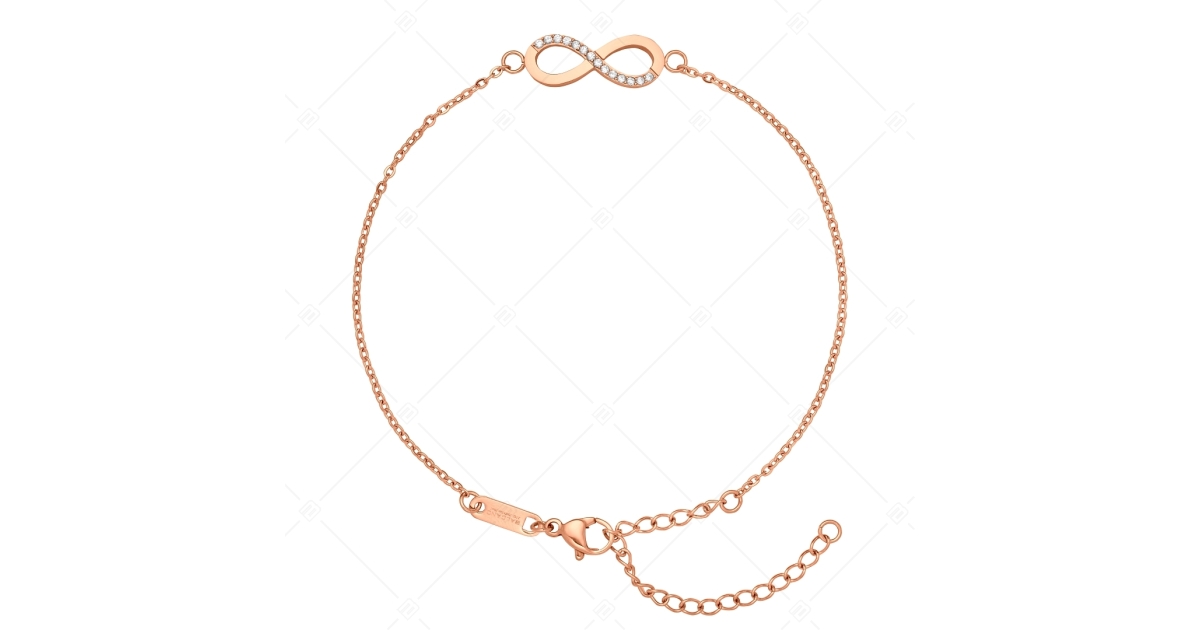 Végtelen szimbólummal ellátott, apró cirkónia kristályokkal díszített, lapított anker típusú bokalánc. 316L orvosi nemesacél ékszer, 18K rozé arany bevonattal. Divatos és elegáns kiegészítő, amely anyagának köszönhetően antiallergén, nem kopik, nem mattul el használat során.
