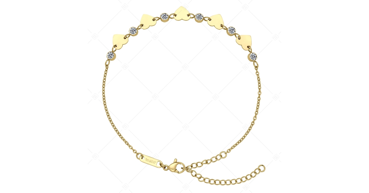 Szívecskés, apró kerek cirkónia kristályokkal díszített, lapított anker típusú bokalánc. 316L orvosi nemesacél ékszer, 18K arany bevonattal. Divatos és elegáns kiegészítő, amely anyagának köszönhetően antiallergén, nem kopik, nem mattul el használat során.