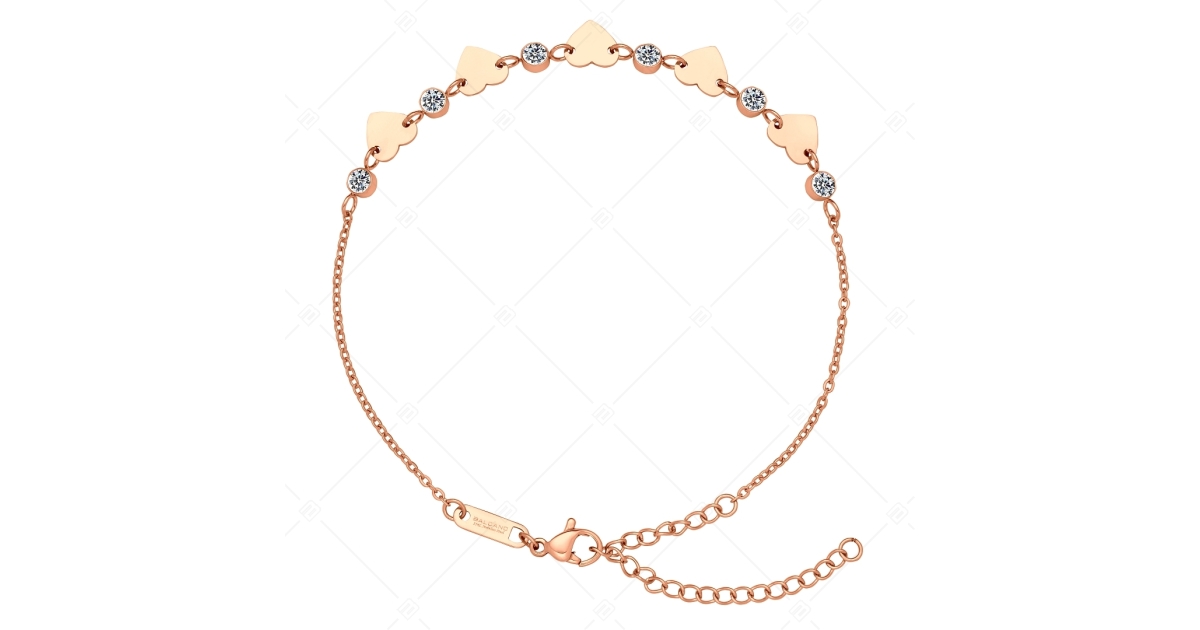 Szívecskés, apró kerek cirkónia kristályokkal díszített, lapított anker típusú bokalánc. 316L orvosi nemesacél ékszer, 18K rozé arany bevonattal. Divatos és elegáns kiegészítő, amely anyagának köszönhetően antiallergén, nem kopik, nem mattul el használat során.