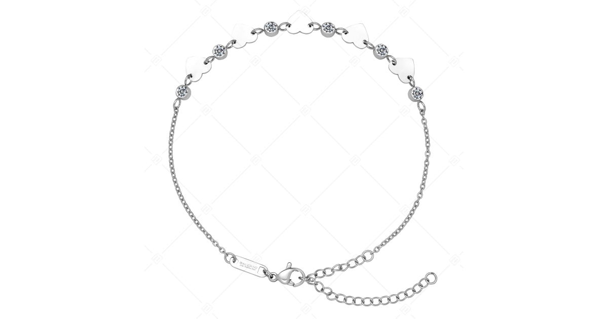 Szívecskés, apró kerek cirkónia kristályokkal díszített, lapított anker típusú bokalánc. 316L orvosi nemesacél ékszer, magasfényű polírozással. Divatos és elegáns kiegészítő, amely anyagának köszönhetően antiallergén, nem kopik, nem mattul el használat során.