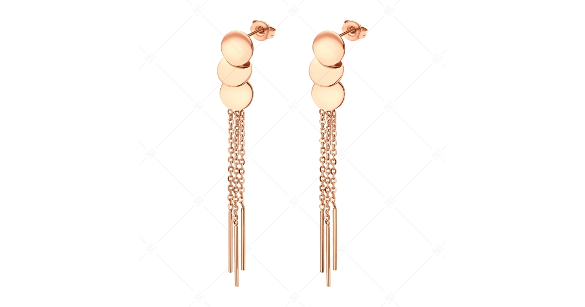 316L nemesacél csüngő fülbevaló 18K rozé arany bevonattal. Három kis kerek lapkából kiinduló vékony anker láncok díszítik. Allergiamentes ékszer így bárki nyugodtan viselheti. Anyagának köszönhetően nem színeződik, nem kopik el és a gyógyvízre vagy tisztítószerekre sem érzékeny. Egyedi kiegészítő bármilyen alkalomra.