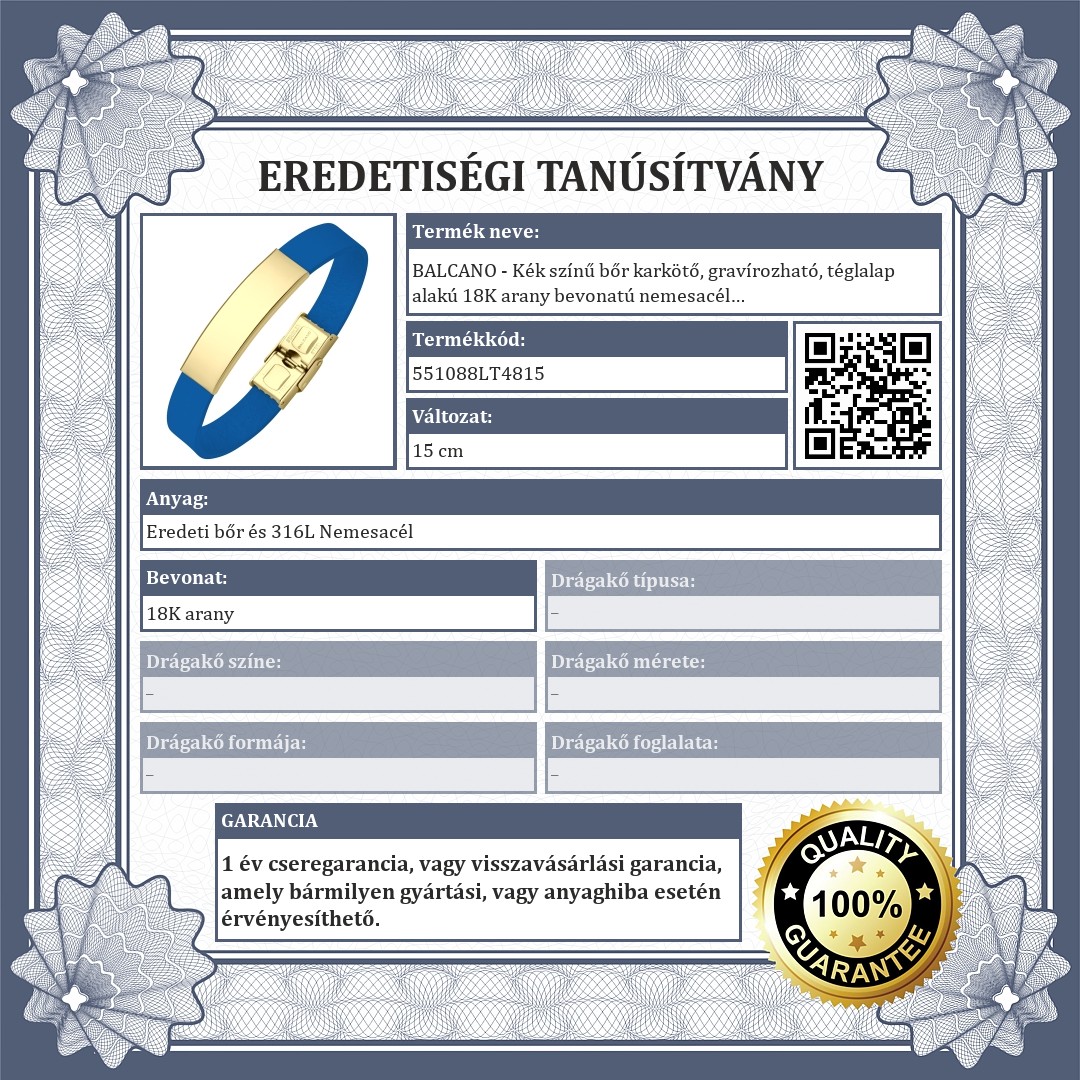 Kék színű, valódi marhabőr karkötő, amit egy téglalap alakú, 18K arany bevonatú 316L nemesacél fejrész díszít. Felülete sima, így egyedi ékszer készíthető belőle gravírozással.