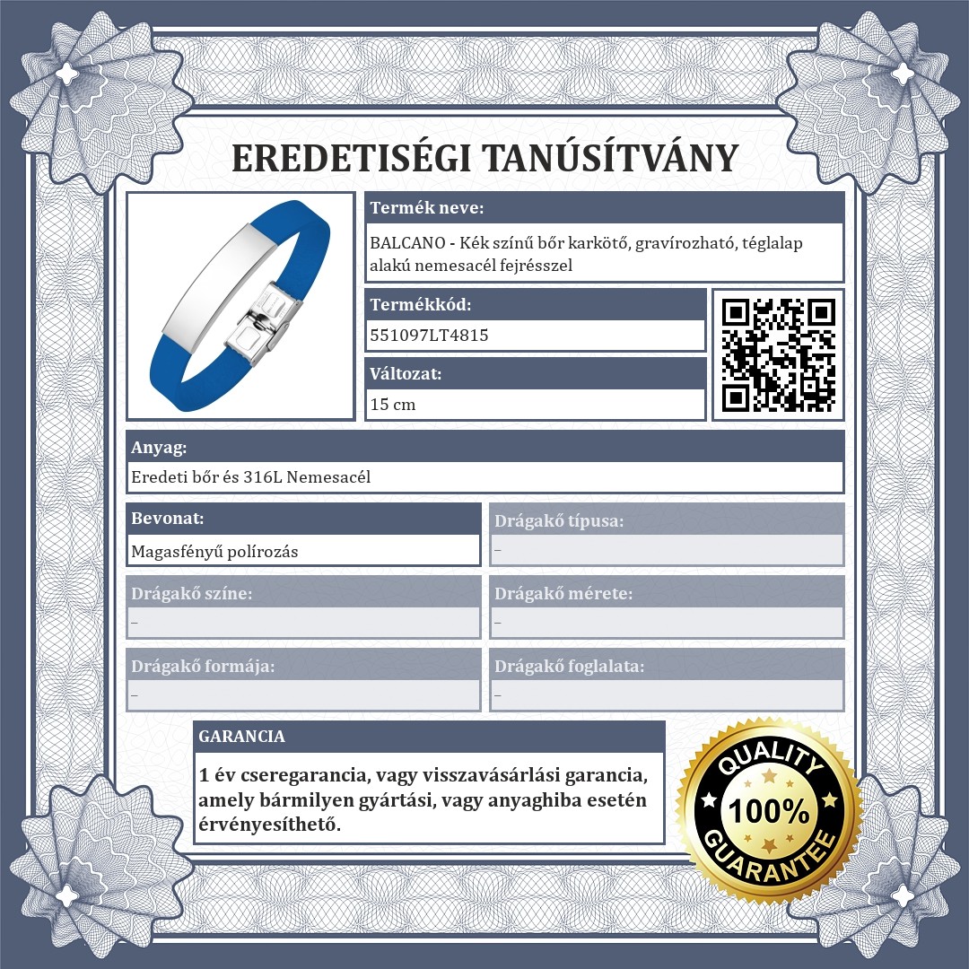Kék színű, valódi marhabőr karkötő, amit egy téglalap alakú, magasfényű polírozással ellátott 316L nemesacél fejrész díszít. Felülete sima, így egyedi ékszer készíthető belőle gravírozással.