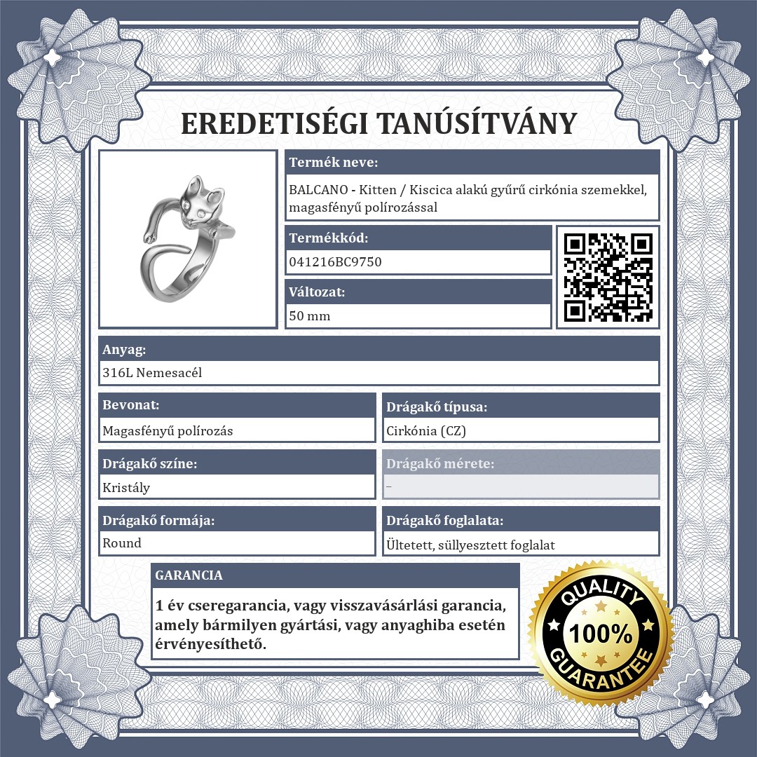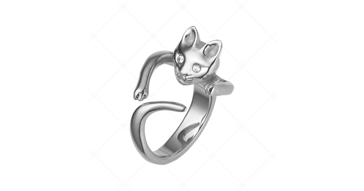 Macska formájú gyűrű, aminek két víztiszta cirkónia drágakőből készültek a szemei. Az ujjra felhúzva olyan, mintha a cica körbeölelné azt. Antiallergén, 316L orvosi, rozsdamentes nemesacél ékszer, magasfényű polírozással ellátva.
