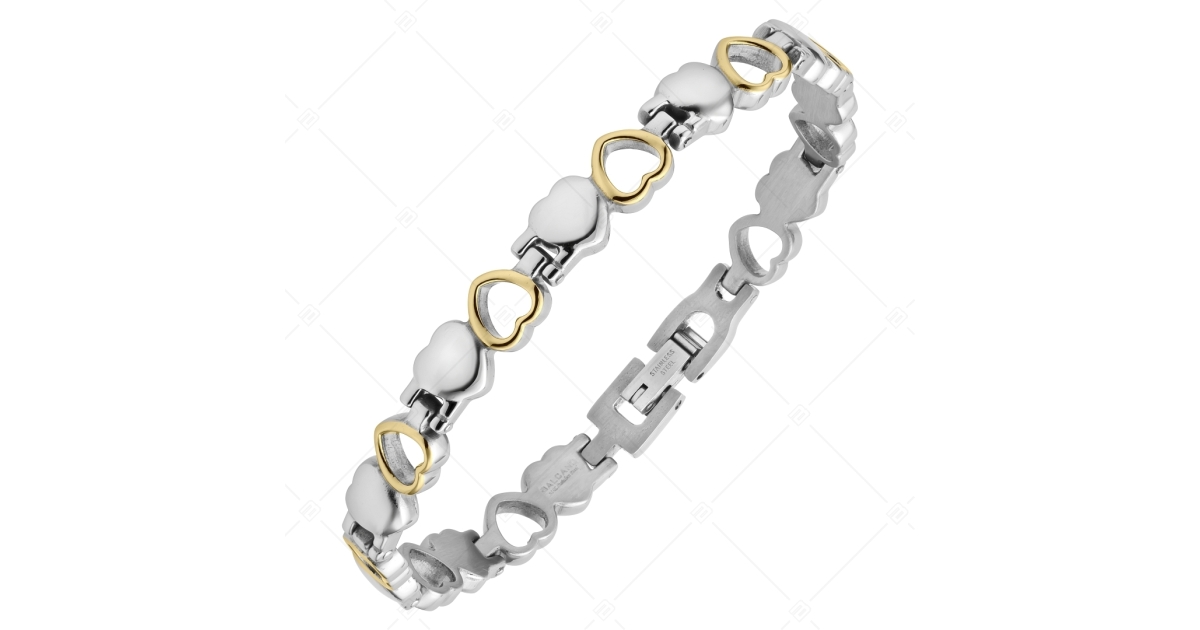Nemesacél karkötő az örök romantikusok számára. 316L orvosi rozsdamentes, acél ékszer magasfényű polírozással és 18K arany bevonattal díszített szívecskékből álló ékszer.