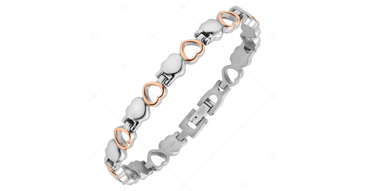 Nemesacél karkötő az örök romantikusok számára. 316L orvosi rozsdamentes, acél ékszer magasfényű polírozással és 18K rozé arany bevonattal díszített szívecskékből álló ékszer.