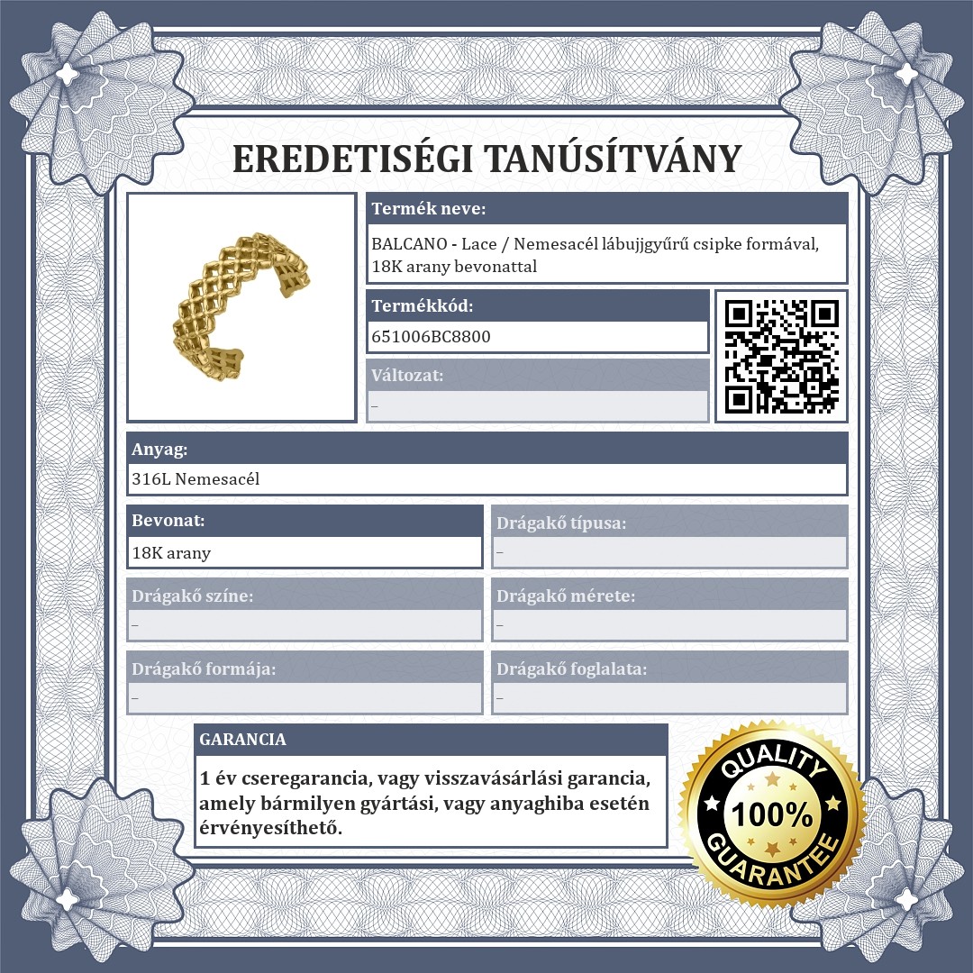 Allergiamentes 316L orvosi, rozsdamentes acél ékszer, 18K arany bevonattal. Anyagának köszönhetően jól bírja a vizet és kopásálló. A lábujjgyűrű egy csipke mintát ábrázol.