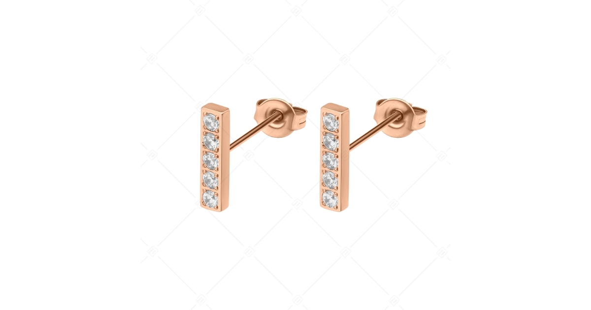 Ragyogó, víztiszta cirkónia drágakövekkel díszített, bedugós, keskeny,téglalap alakú fülbevaló. Kiváló minőségű 18K rozé arany bevonatos, 316L orvosi, antiallergén nemesacél ékszer, amely biztonságos pillangó zárral készült.