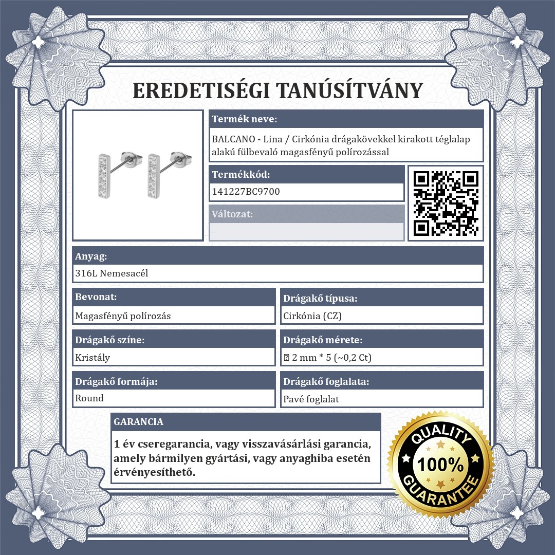 BALCANO - Lina / Cirkónia drágakövekkel kirakott téglalap alakú fülbevaló magasfényű polírozással
