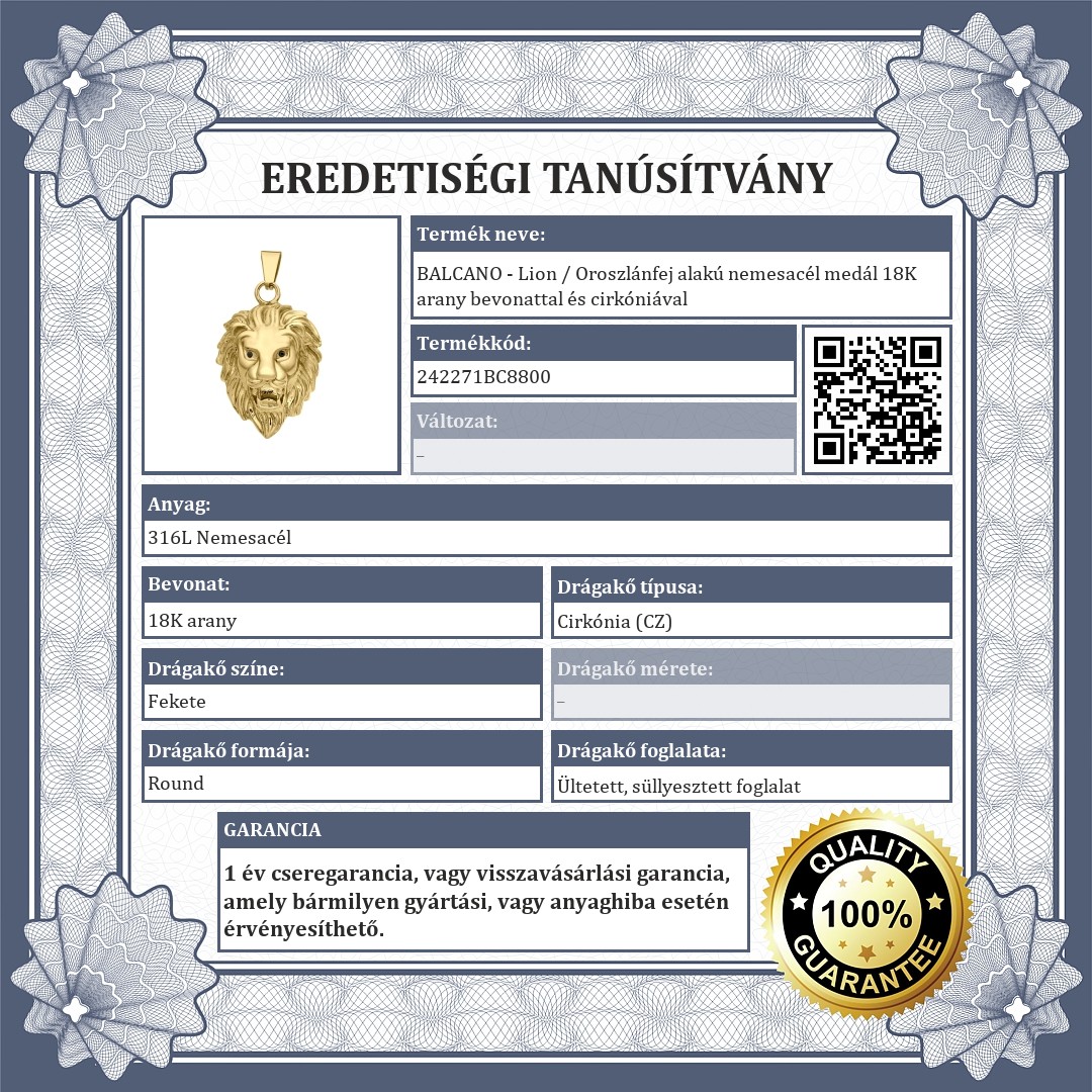 BALCANO - Lion / Oroszlánfej alakú nemesacél medál 18K arany bevonattal és cirkóniával