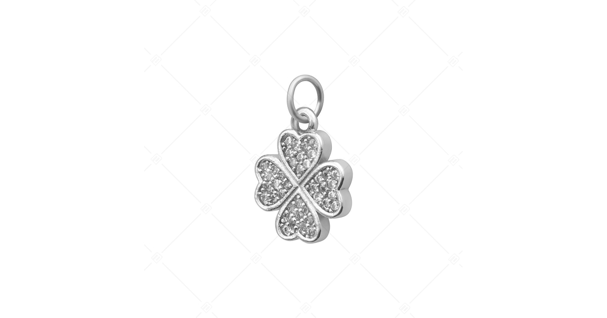 Lóhere formájú charm, csillogó, víztiszta cseh kristályokal. Ezüst bevonatos, rézből készült kiegészítő.