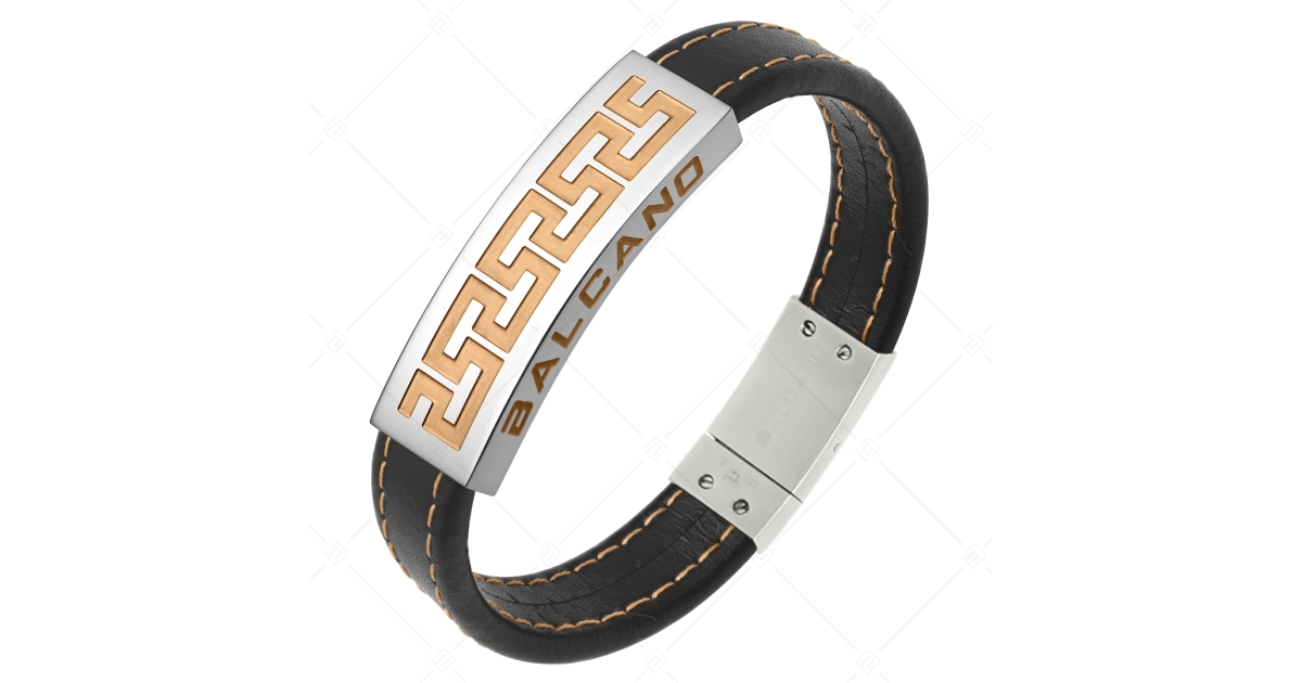 Divatos valódi bőr karkötő, antiallergén 316L nemesacél fejrésszel, amelyet 18K rozé arany bevonattal ellátott görög minta díszít, körben ezüst színű nemesacél karikákkal kiegészítve. Trendi és fiatalos ékszer férfiak számára.