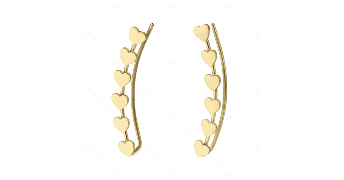 Divatos, fül ívére simuló fülbevaló, amelyet egy sorban több kisebb szívecske díszít. 316L orvosi rozsdamentes, antiallergén nemesacél kiegészítő, csillogó 18K arany bevonattal.