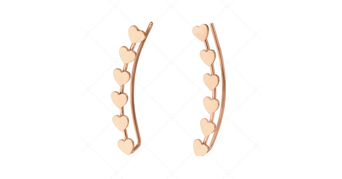 Divatos, fül ívére simuló fülbevaló, amelyet egy sorban több kisebb szívecske díszít. 316L orvosi rozsdamentes, antiallergén nemesacél kiegészítő, csillogó 18K rozé arany bevonattal.