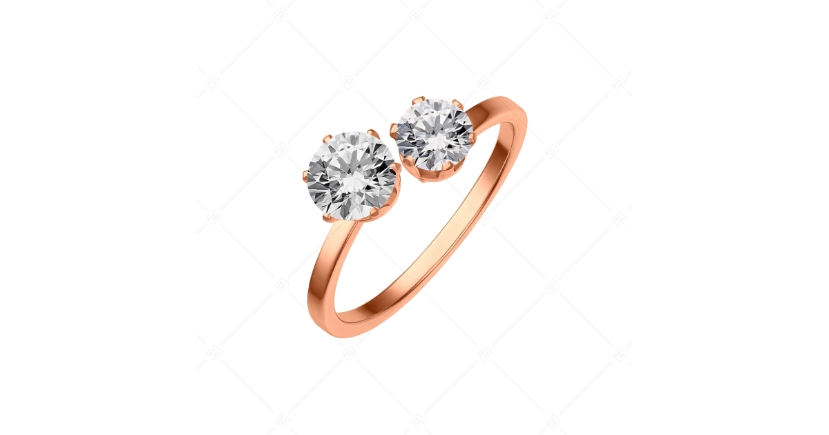 Egyedi, felül nyitott fejű gyűrű, két víztiszta cirkónia drágakővel díszítve. Antiallergén, 316L orvosi, rozsdamentes nemesacél ékszer magasfényű polírozással és 18K rozé arany bevonattal.
