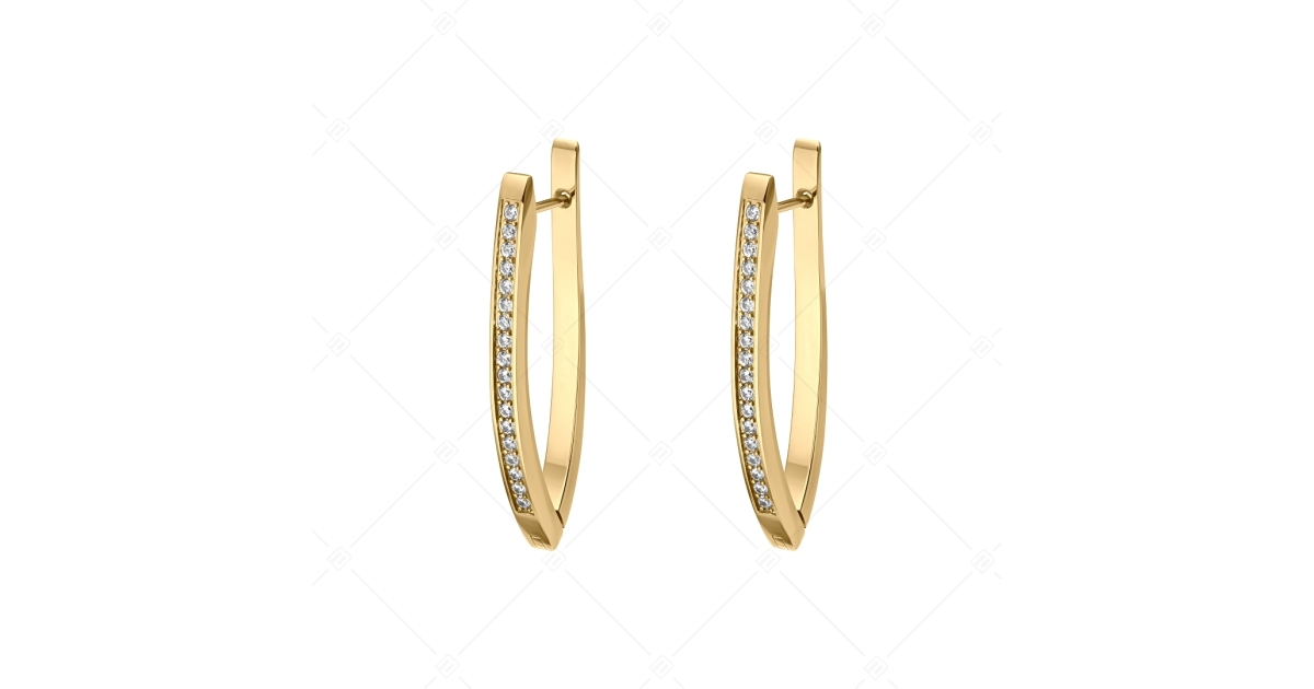 Elegáns női fülbevaló, cirkónia kristályokkal díszítve. Kiváló minőségű 316L orvosi nemesacél ékszer, 18K arany bevonattal. Bepattintós fülbevaló, ami biztonságos és kényelmes viseletet biztosít.