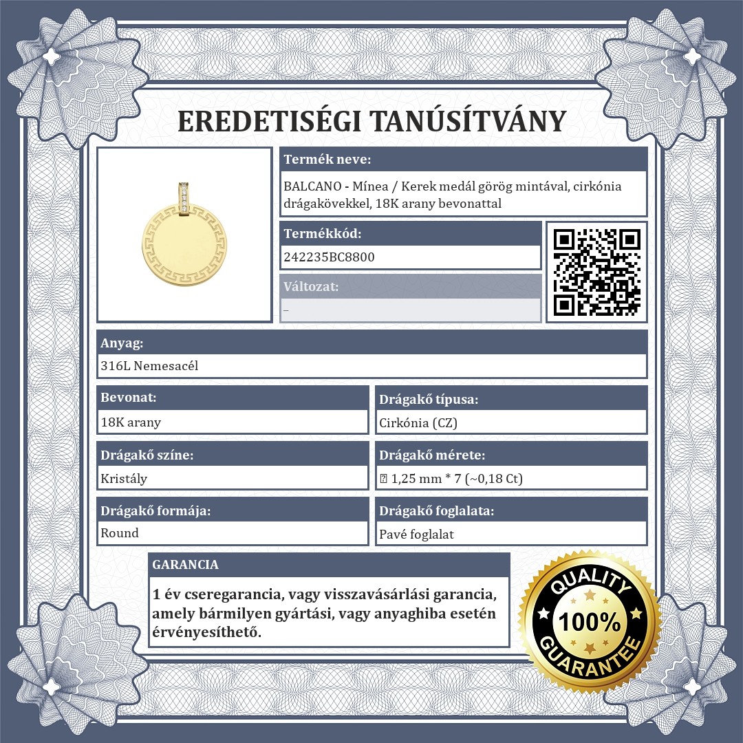 Antiallergén, orvosi 316L nemesacél, kerek medál, 18K arany bevonattal. A medált körben a szélén, bemart, görög minta díszíti,a medálfület pedig, csillogó, víztiszta, kerek cirkónia kövek ékesítenek.