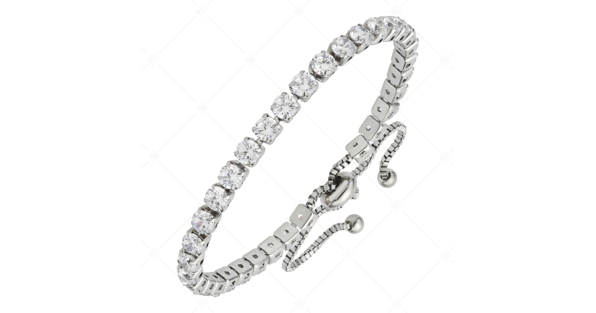 Káprázatos csillogású 316L nemesacél tenisz karkötő. Antiallergén, orvosi fémből készült magasfényű polírozással, karmos foglalatba erősített, víztiszta cirkónia drágakövekkel díszítve.