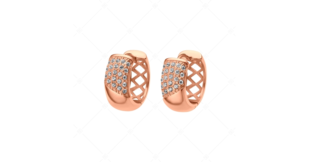 Bepattintós, karika fülbevaló, víztiszta cirkónia drágakövekkel díszítve. 316L orvosi nemesacél ékszer, kiváló minőségű 18K rozé arany bevonattal. Különleges kialakítású az elülső részén a kristályokkal, hátsó része pedig áttört mintával díszített.