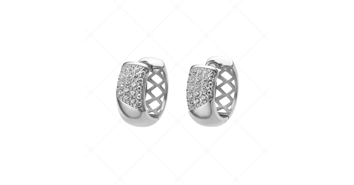 Bepattintós, karika fülbevaló, víztiszta cirkónia drágakövekkel díszítve. 316L orvosi nemesacél ékszer, kiváló minőségű magasfényű polírozással. Különleges kialakítású az elülső részén a kristályokkal, hátsó része pedig áttört mintával díszített.