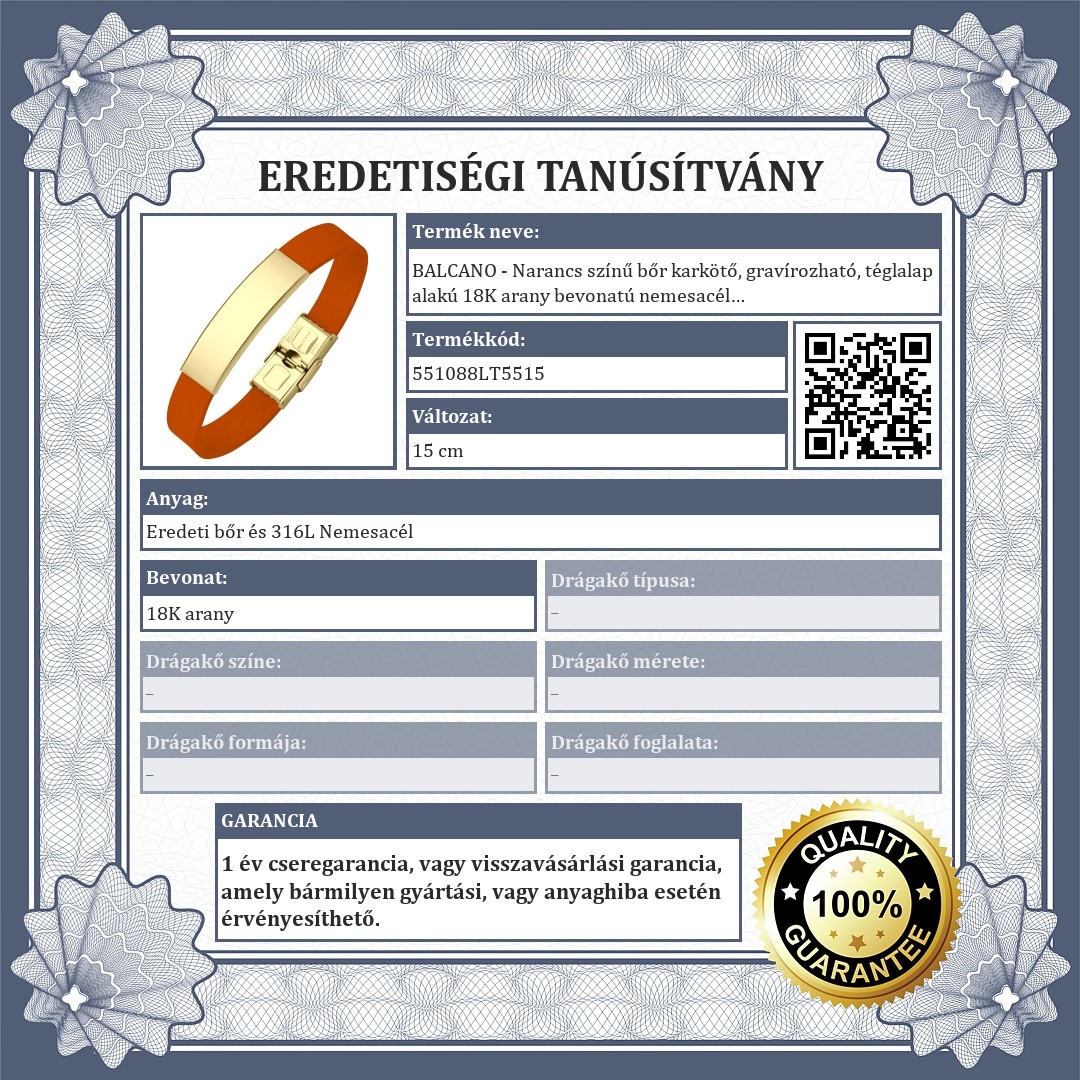 Narancs színű, valódi marhabőr karkötő, amit egy téglalap alakú, 18K arany bevonatú 316L nemesacél fejrész díszít. Felülete sima, így egyedi ékszer készíthető belőle gravírozással.