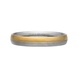 Antiallergén 316L nemesacél karikagyűrű körben egy kissé átlósan végigfutó szálrahúzott (matt) sávval és 18K arany bevonattal, a többi részén magas fényű polírozással. Divatos és elegáns ékszer. Lekerekített, sima belső kialakításának köszönhetően maximálisan kényelmes viselet.