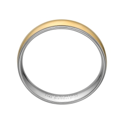 Antiallergén 316L nemesacél karikagyűrű körben egy kissé átlósan végigfutó szálrahúzott (matt) sávval és 18K arany bevonattal, a többi részén magas fényű polírozással. Divatos és elegáns ékszer. Lekerekített, sima belső kialakításának köszönhetően maximálisan kényelmes viselet.
