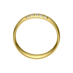 Antiallergén 316L nemesacél karikagyűrű körben egy kissé átlósan végigfutó szálrahúzott (matt) sávval és 18K arany bevonattal, a többi részén magas fényű polírozással. Az enyhén kidomborodó sávot csillogó cirkónia ékkövek díszítik. Divatos és elegáns ékszer. Lekerekített, sima belső kialakításának köszönhetően maximálisan kényelmes viselet.