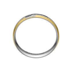 Antiallergén 316L nemesacél karikagyűrű körben egy kissé átlósan végigfutó szálrahúzott (matt) sávval és 18K arany bevonattal, a többi részén magas fényű polírozással. Az enyhén kidomborodó sávot csillogó cirkónia ékkövek díszítik. Divatos és elegáns ékszer. Lekerekített, sima belső kialakításának köszönhetően maximálisan kényelmes viselet.