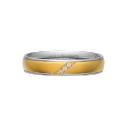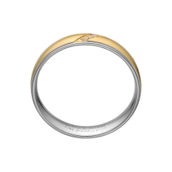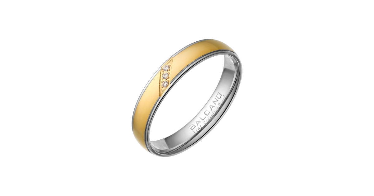 Antiallergén 316L nemesacél karikagyűrű körben egy kissé átlósan végigfutó szálrahúzott (matt) sávval és 18K arany bevonattal, a többi részén magas fényű polírozással. Az enyhén kidomborodó sávot csillogó cirkónia ékkövek díszítik. Divatos és elegáns ékszer. Lekerekített, sima belső kialakításának köszönhetően maximálisan kényelmes viselet.