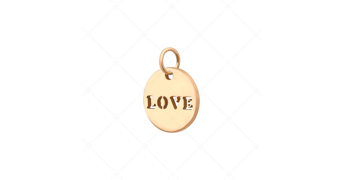 Antiallergén, 316L nemesacél kerek charm, "LOVE" felirattal díszítve. Tartós, kiváló minőségű kiegészítő, 18K rozé arany bevonattal.