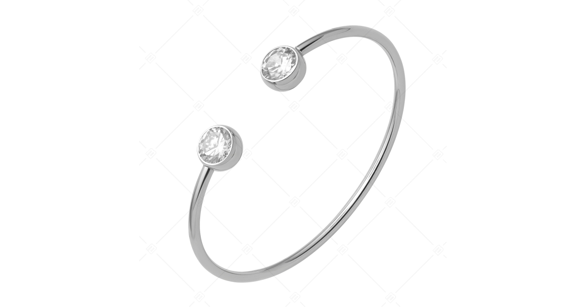 Gyönyörű és mutatós karperec, amelynek végeit két nagyobb, kerek, víztiszta cirkónia ékkő díszít. A merev karkötő 316L orvosi nemesacélból készült, amely a hétköznapi viselet során nem kopik, nem deformálódik el. Antiallergén kiegészítő, magasfényű polírozással.