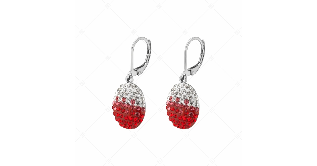 Ragyogó, víztiszta és élénk piros cseh kristályokkal kirakott ovális formájú, csüngő fülbevaló. 316L orvosi rozsdamentes acél ékszer, amely anyagának köszönhetően rendkívül tartós, nem kopik, nem színeződik el.