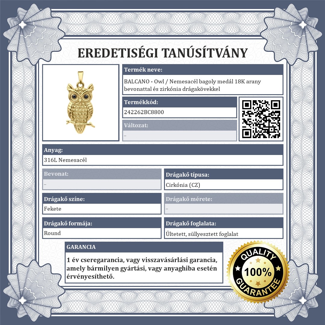 Bagoly medál fekete cirkónia drágakő szemekkel. 316L orvosi rozsdamenetes nemesacél ékszer 18K arany bevonattal. Anyagának köszönhetően allergiamentes, nem kopik és nem szineződik el.