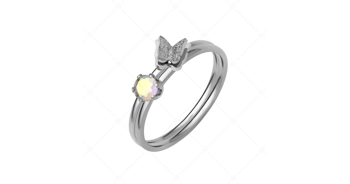 Dekoratív, két gyűrűből álló szett. Az egyiket csillámos felületű, dupla szárnyas pillangó formájú fejrész ékesít, míg a másik gyűrűt egy csodás, színjátszó cirkónia kristály díszít. Antiallergén, 316L nemesacél ékszer, ezüstösen csillogó magasfényű polírozással.