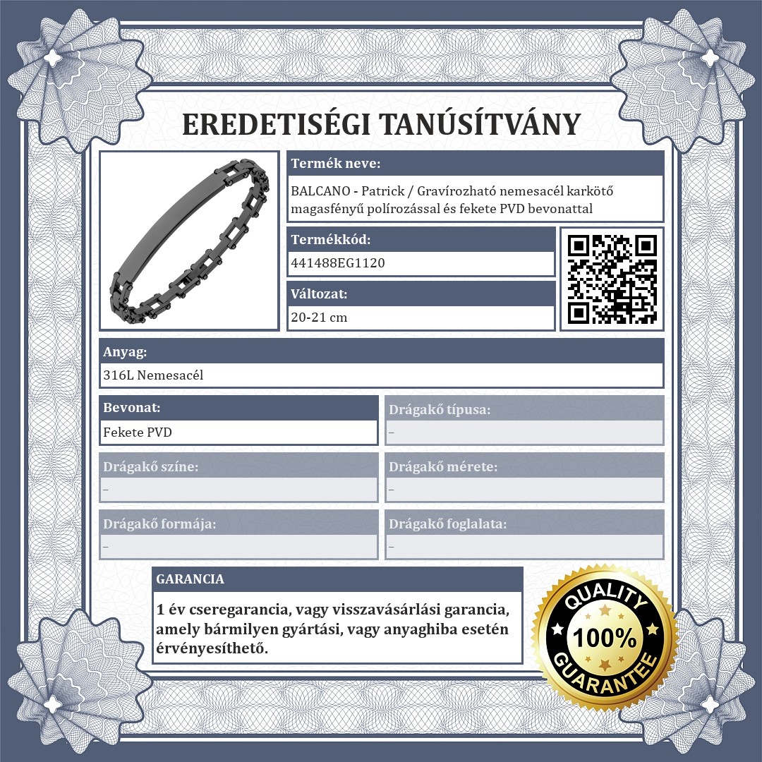 Gravírozható nemesacél karkötő különleges láncszemekből. Az ékszer anyaga 316L orvosi rozsdamentes acél magasfényű polírozással és fekete PVD bevonattal. A karkötő kapocs egy toldószemmel van ellátva, ami szükség esetén kivehető, ha túl nagy a méret. Anyagának köszönhetően nem kopik és nem színeződik el, sőt a víz sem árt neki. Egyedi és kényelmes ékszer.