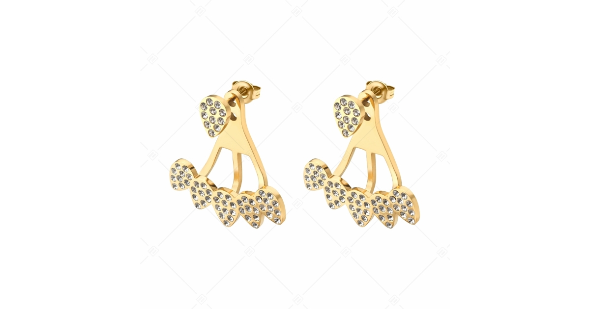 Divatos és egyedi kialakítású, bedugós fülbevaló cirkónia kristályokkal kirakva. 316L orvosi rozsdamentes acél ékszer, 18K arany bevonattal, amely anyagának köszönhetően rendkívül tartós, nem kopik, nem színeződik el.