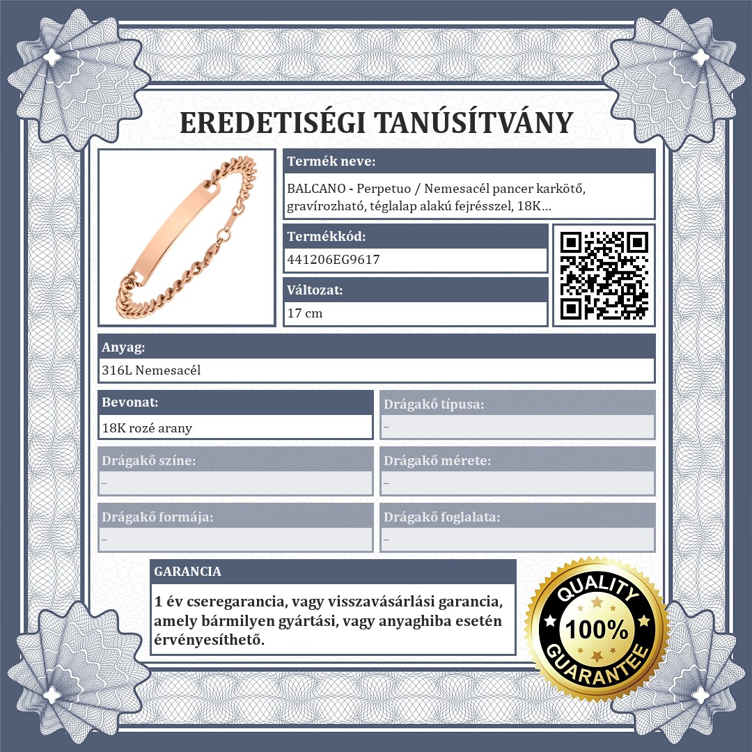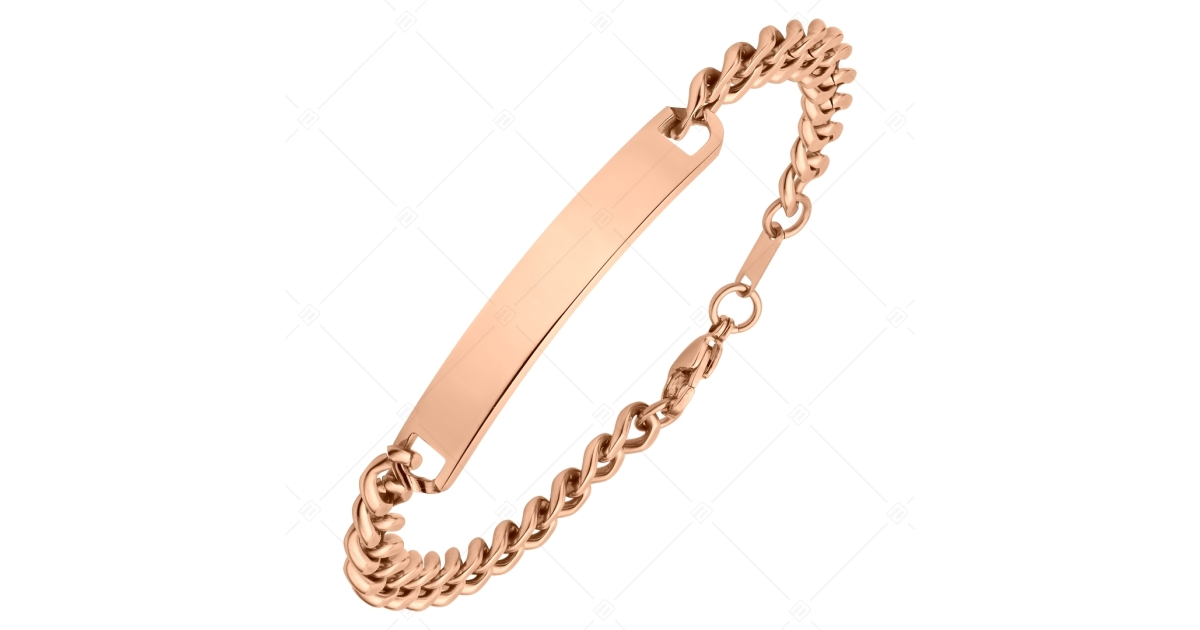 Impozáns, klasszikus, pancer lánc típusú karkötő, gravírozható, téglalap alakú fejrésszel ellátva. 316L orvosi, rozsdamentes, antiallergén nemesacél ékszer, 18K rozé arany bevonattal. A vastag láncos, divatos karkötő különleges ajándék lehet egyedi gravírozással.
