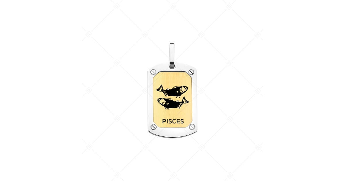 Antiallergén, nemesacél, téglalap alakú horoszkópos medál a Halak csillagjegy képével díszítve. 316L orvosi, rozsdamentes acél ékszer, amely anyagának köszönhetően rendkívül tartós. Magasfényű polírozással, 18K arany bevonatos matt,szálra húzott felületen található a bemaratással és festéssel készült állatövi jegyek szimbóluma.