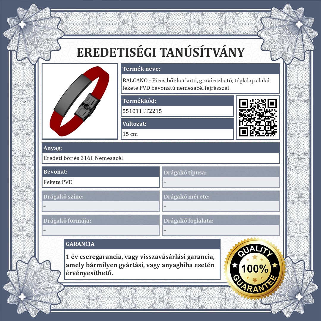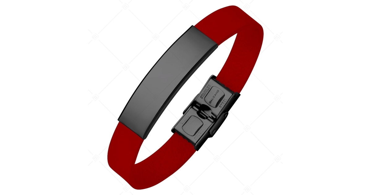 BALCANO - Piros bőr karkötő, gravírozható, téglalap alakú fekete PVD bevonatú nemesacél fejrésszel