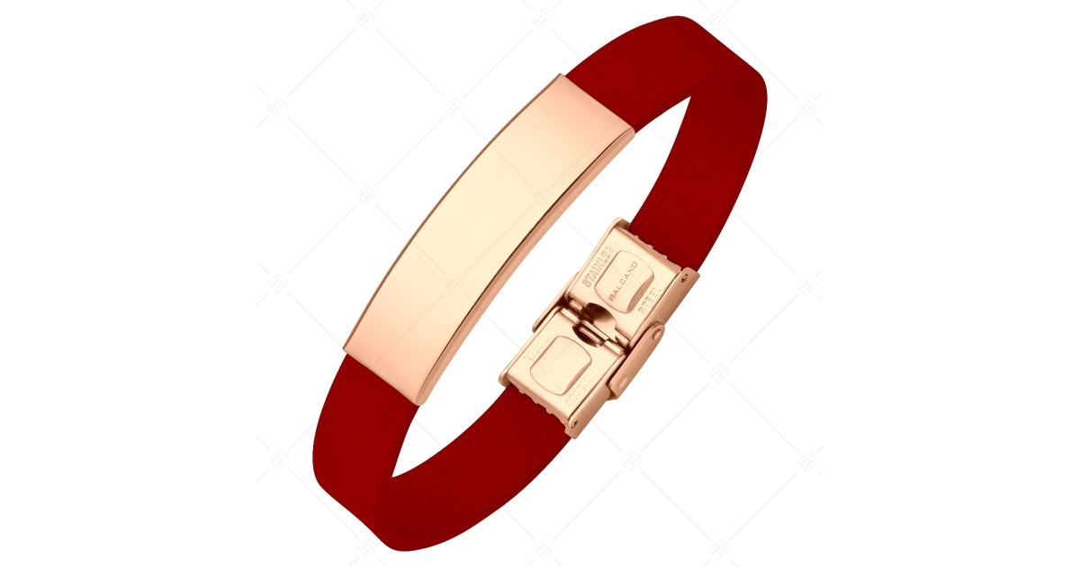 BALCANO - Piros színű bőr karkötő, gravírozható, téglalap alakú 18K rozé arany bevonatú nemesacél fejrésszel