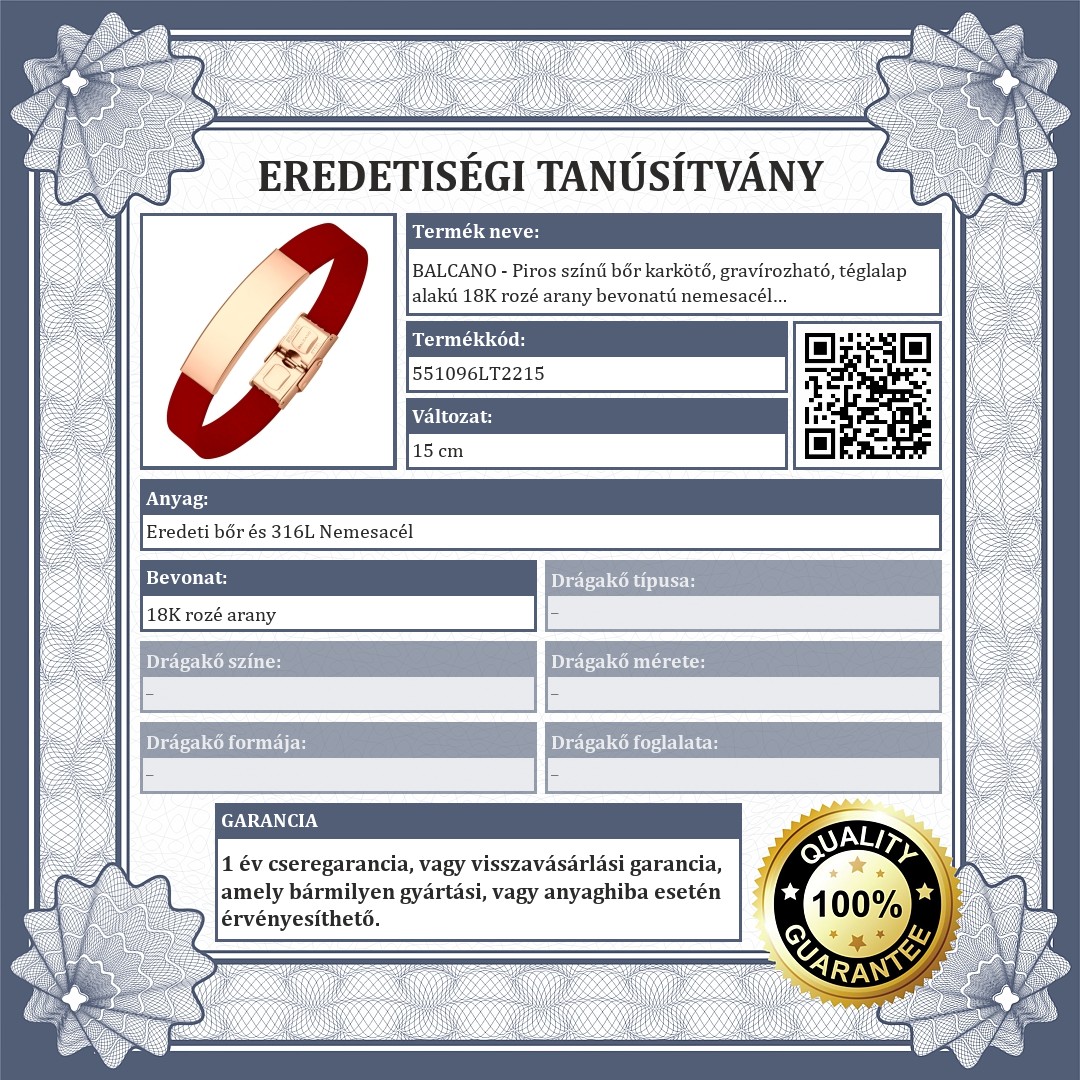 | Anyag színe: | Piros / Rozé arany (vörös arany) |