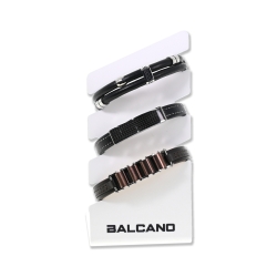 3 db bőr / acél karkötő bemutatására alkalmas plexi állvány.